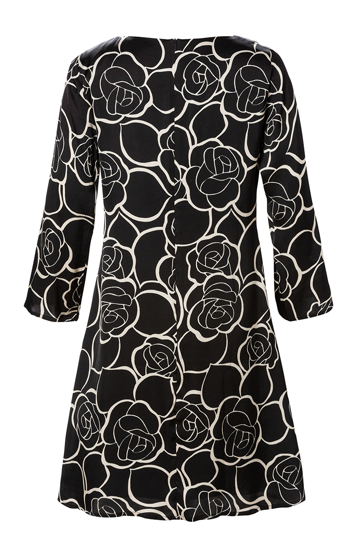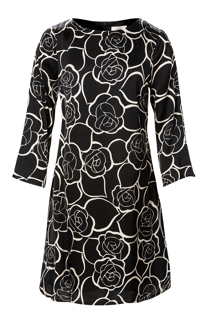 Maja klänning här i ett modernt print på en svart botten. Tillverkad i vacker skimrande viskos med ett mjukt foder i cupro. Klänningen går strax ovan knäet, har en båtformad hals och en trekvarts ärm. Dragkedjan sitter mitt bak i ryggen. Klänningen är tillverkad i vår fabrik i Sverige för en hållbar framtid! Titta i vår storleksguide för din rätta storlek.