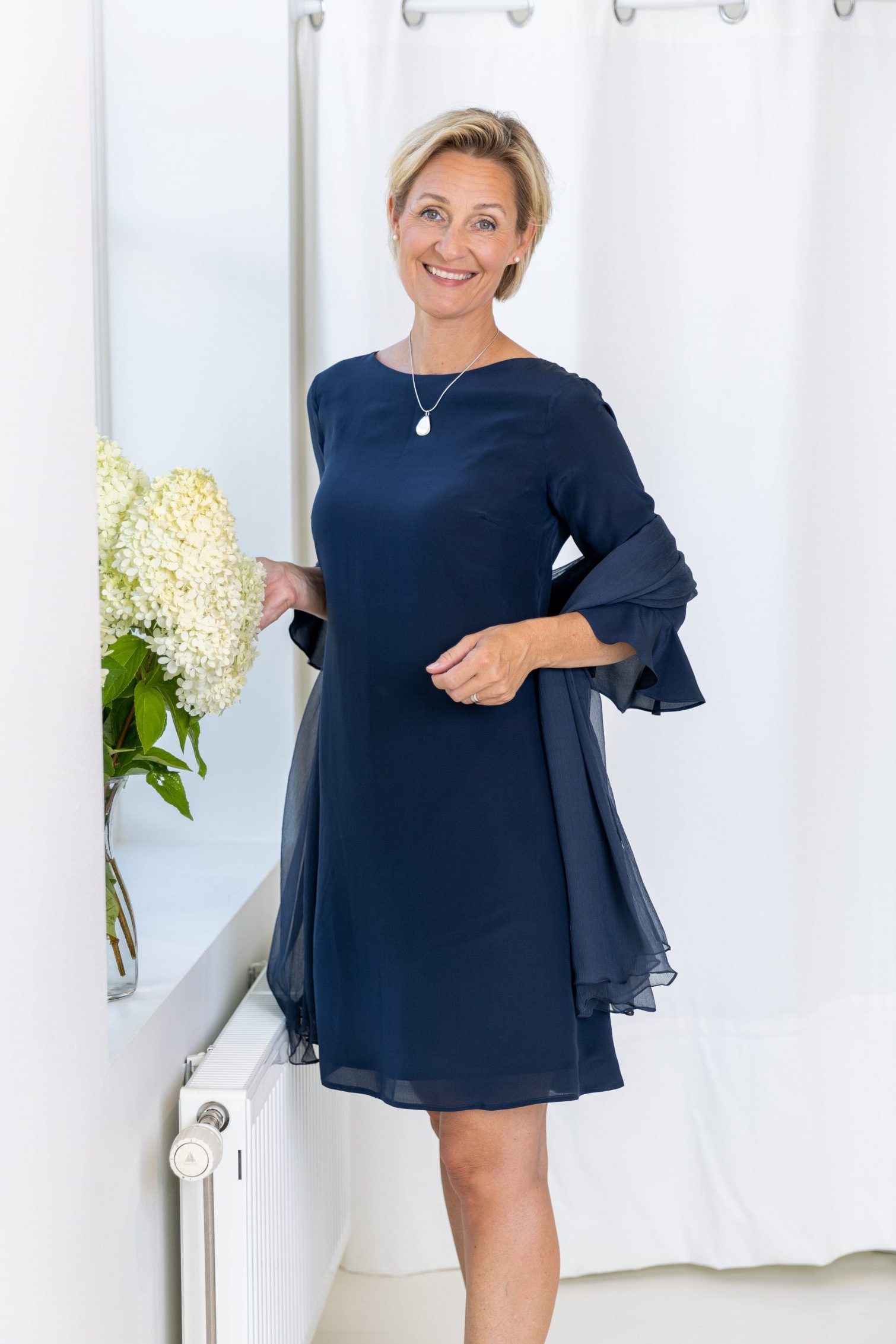 Maja klänning är en a-linje formad klänning med en ljuvlig ärm som avslutas som en frill. Denna klänning är en riktig liten pärla. Perfekt för dig som tycker om att klä dig lite mörkare på vintern men ändå vill ha något lite extra. Det får du med volangen på ärmen. Jättefin som den är eller addera på en sidenssjal i chiffon. Klänningen är sydd i Italiensk crepe de chine siden och har ett foder i finaste cupro. Går bra att tvätta försiktigt för hand eller i en ny tvättmaskin med sidenprogram och utan centrifug. Krymper lite grand vid tvätt men går att stryka ut när den precis torkat. Står du mellan två storlekar ta den större.