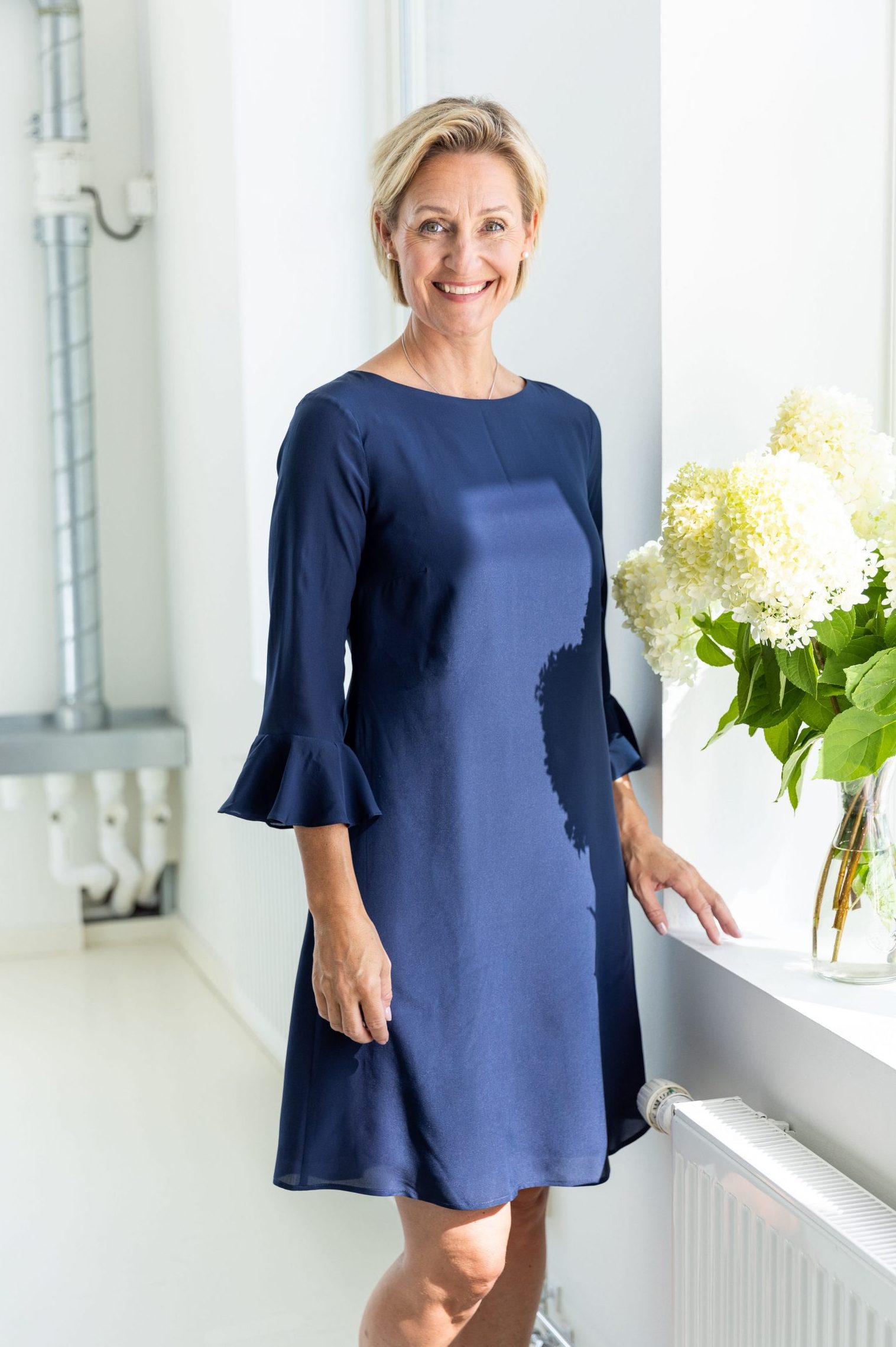 Karin klänning är en mycket omtyckt modell och favorit i Dughults sortiment. Klänningen har ett vackert skuret liv med ärm och en kjol som slutar nedanför knät.