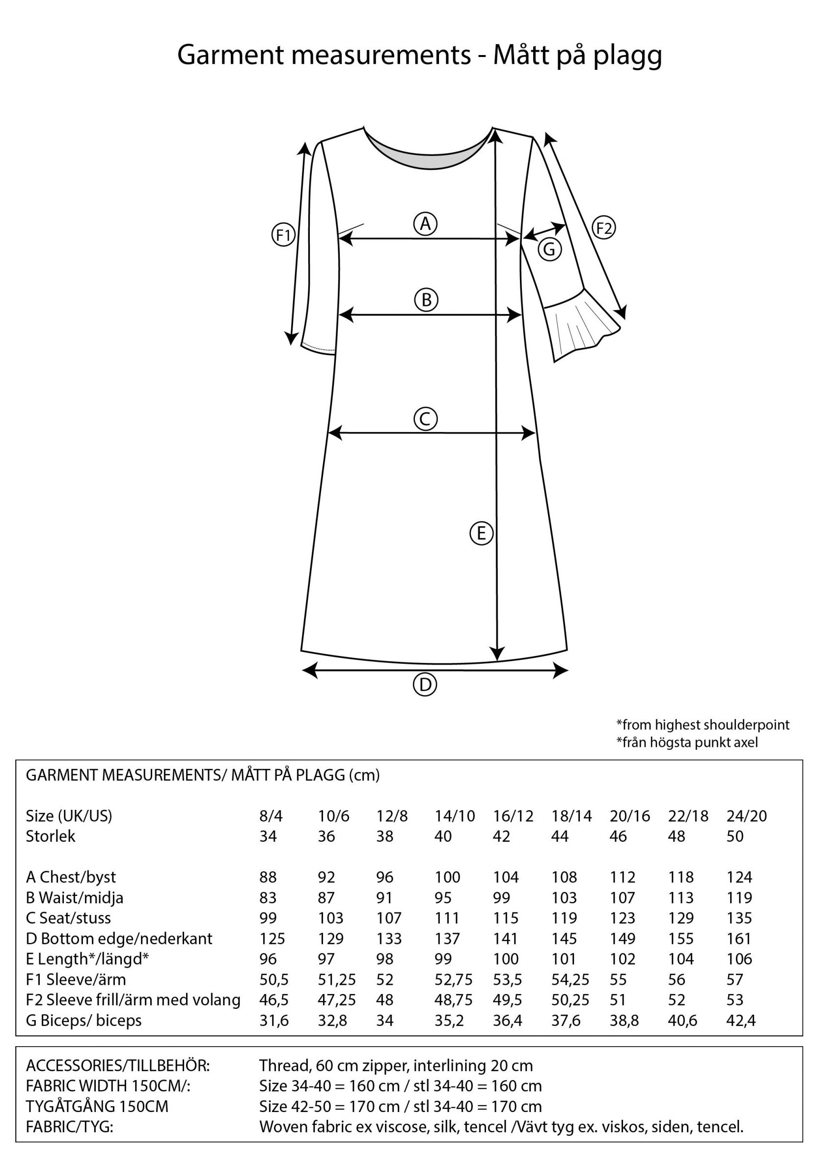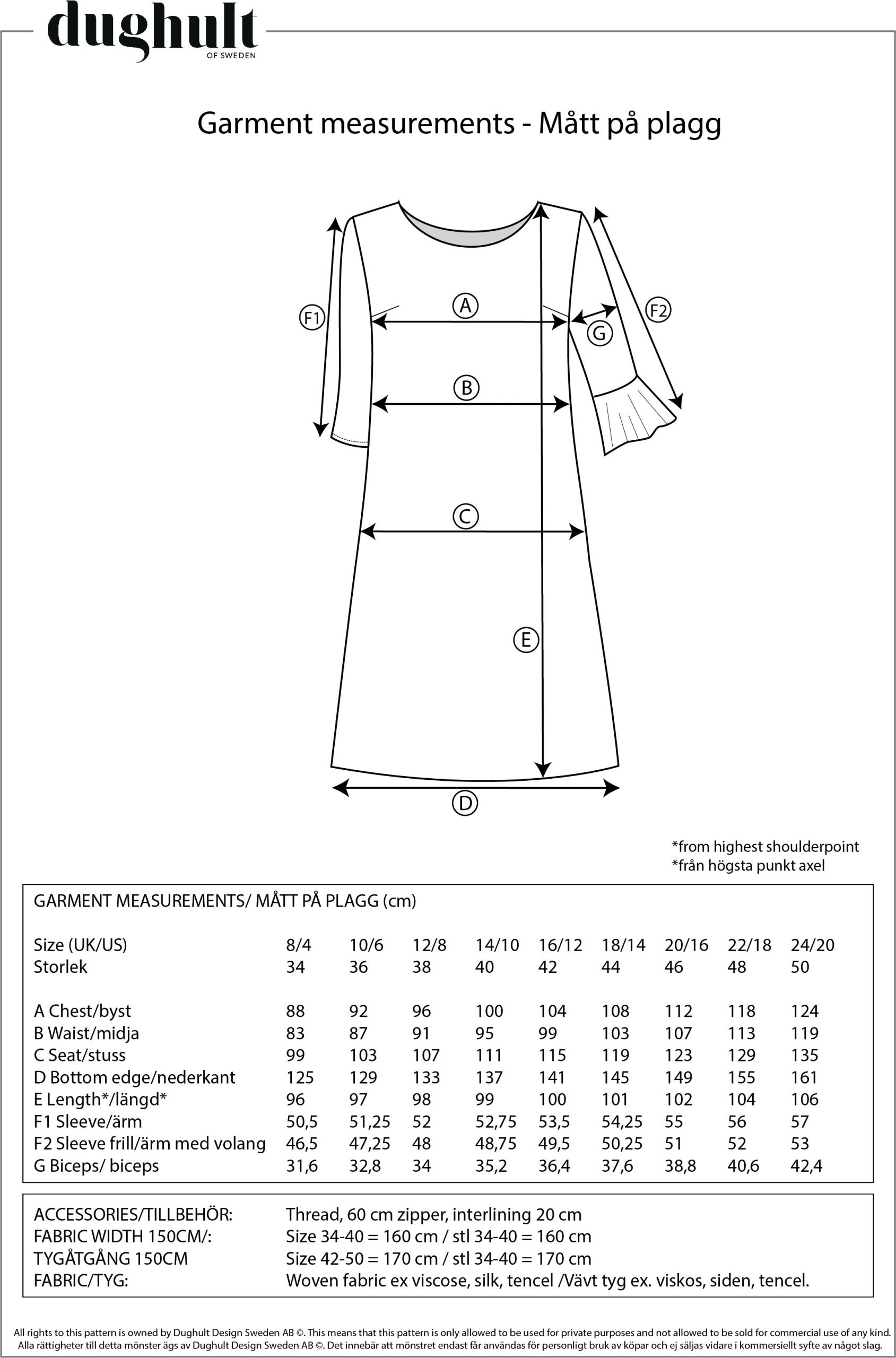 Mönstret finns i storlek 34-50 (storlek UK 8-24 & US 4-20). Paketet inkluderar samtliga storlekar och kommer förpackat i ett kuvert. Svårighetsgrad lätt/medel. Sömsmån är inkluderat i mönstret som kommer med tydliga sömnadsinstruktioner där du kan följa steg för steg. Samtliga beskrivningar är både på engelska och svenska och finns som pappersmönster eller digital pdf för omgående leverans.