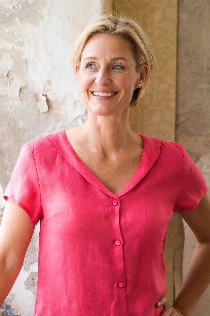 Underbara Mimmi blus har en fin v-ringning med sjalkrage och knäppning mitt fram. Blusen har en kort ärm och passar lika bra till byxa som kjol.
