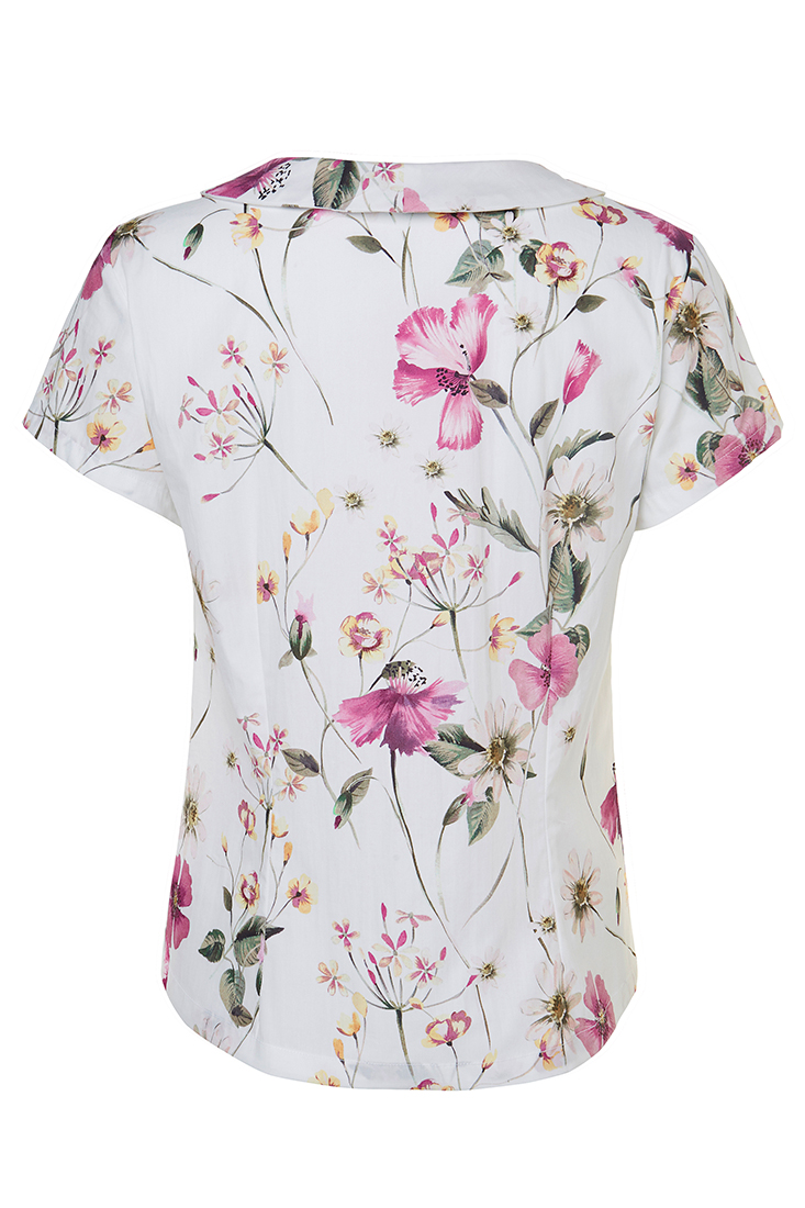 Our beautiful Gina blouse is made of Italian silk with a beautiful dark blue bottom and white-gray roses. The blouse has a rounded, very comfortable neck with three-quarter sleeve that end with a flounce.