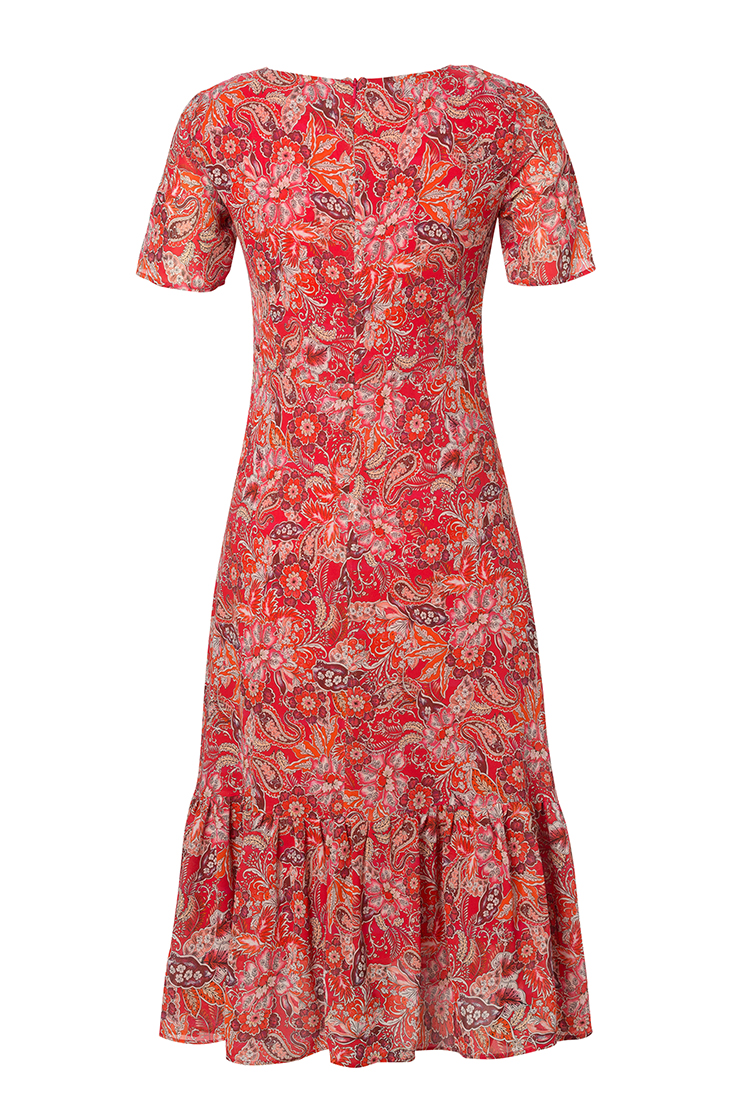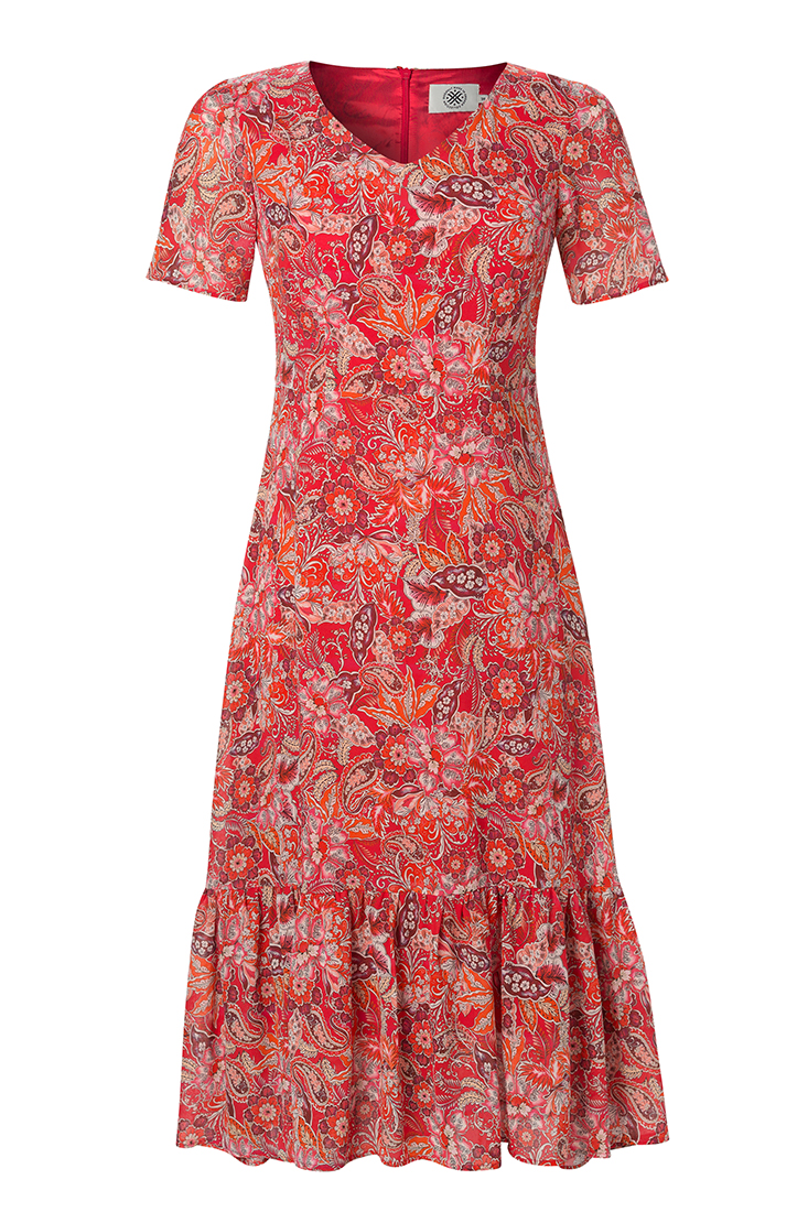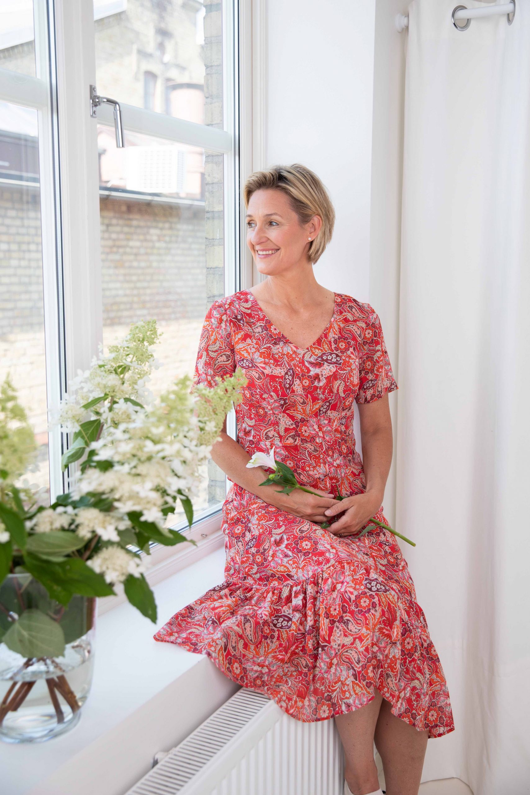 Molly klänning är en underbar modell med avskuret liv, kort ärm och med v-formad hals. Klänningen är sydd i ett rött, lite tunnare viskostyg med ett mjukt foder i cupro. Riktigt vacker med en bredare volang nertill. Den här klänningen är lika fin på kontoret som på sommarfesten. Tillverkad på vår fabrik i Sverige för en hållbar framtid! Titta i vår storleksguide för din rätta storlek.
