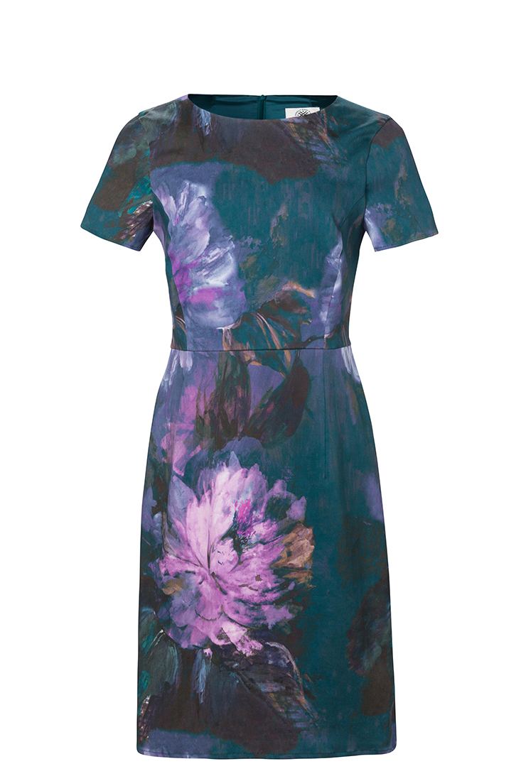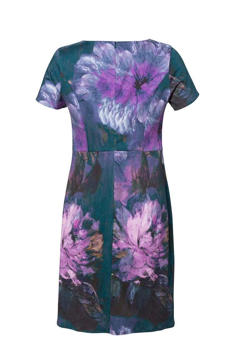 Stiliga Natalie klänning har en härlig klassisk prinsesskärning och en kort ärm. Här i ett vackert print av stora pioner i mustiga höstfärger på en mörkgrön botten. Tillverkad i en härlig bomullsstrech och fodrad med mjukt cuprofoder och dragkedja mitt bak. Klänningen är formad i midjan vilket gör att den sitter fantastiskt fint på en kurvig kropp. En klänning att trivas i och som stannar länge i din garderob. Tillverkad på vår fabrik i Sverige för en hållbar framtid! Titta i vår storleksguide för din rätta storlek.