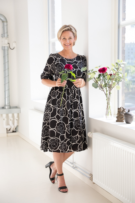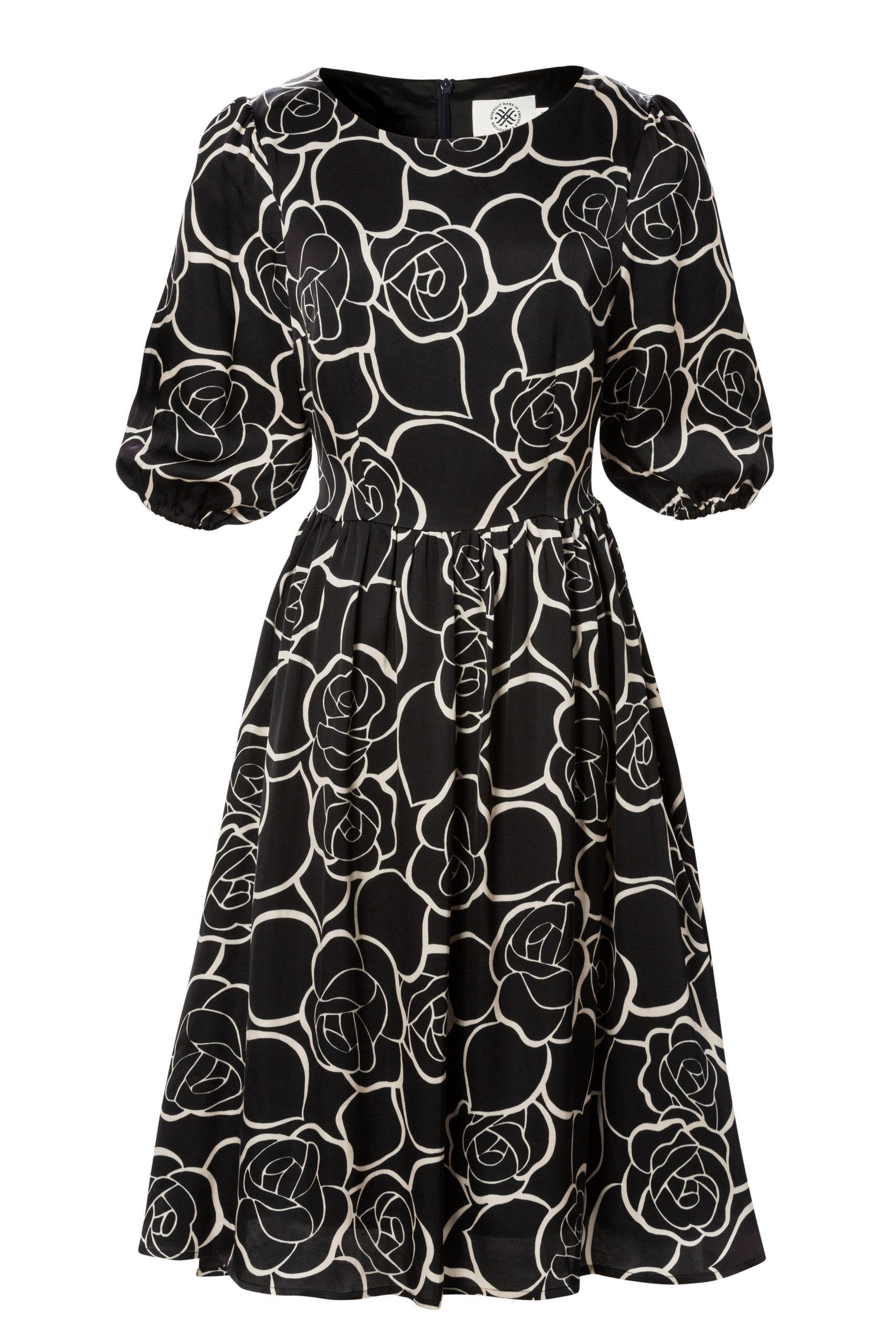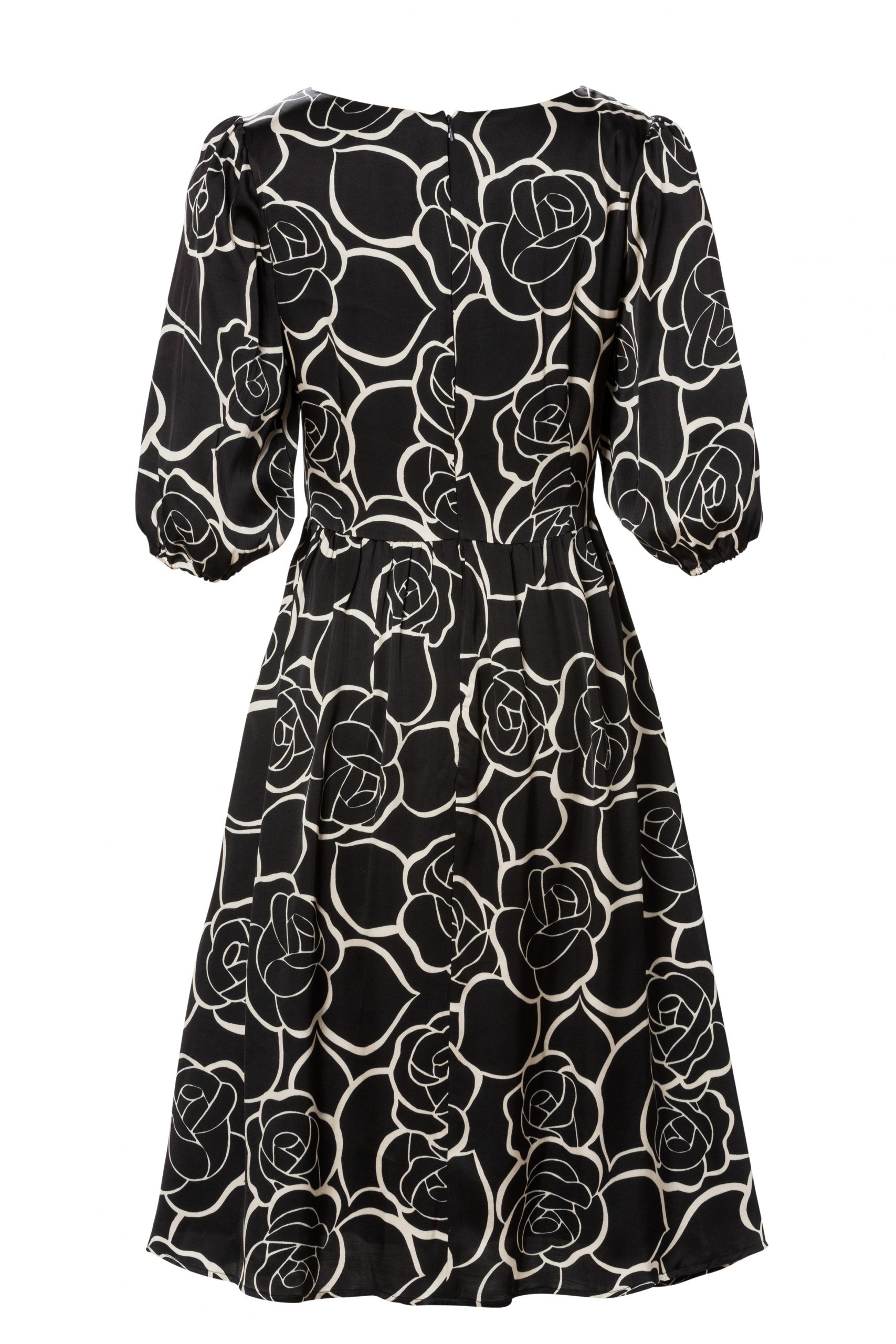 Salina klänning har en rundad hals, trekvarts ärm med ärmslut i resår vilket gör ärmen lite puffig. Midjan är rynkad och kjolen går strax under knät. Tillverkad i en vacker skimrande viskos med ett modernt print på en svart botten. Klänningen är helfodrad med dragkedja mitt bak i ryggen. Tillverkad på fabrik i Sverige för en hållbar framtid!