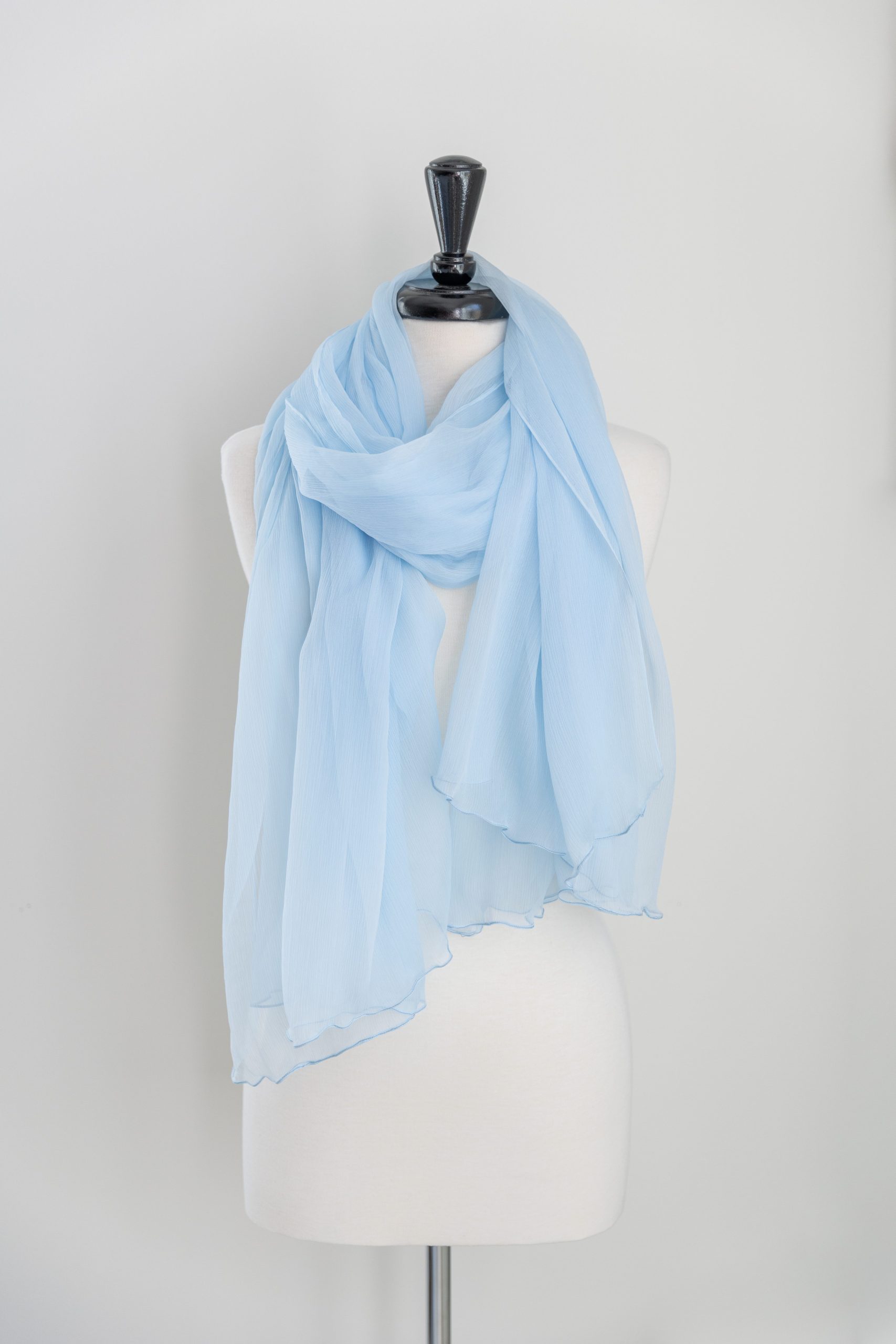 En fantastisk sjal som kan användas till mycket. Lätt och luftig och vacker till både klänning, kavaj och blus. Perfekt att vira runt axlarna istället för en jacka eller kavaj. Siden värmer på vintern och kyler på sommaren. Finns i olika färger, här i en vacker ljusblå. Självklart sydd på fabrik i Sverige för en hållbar framtid!