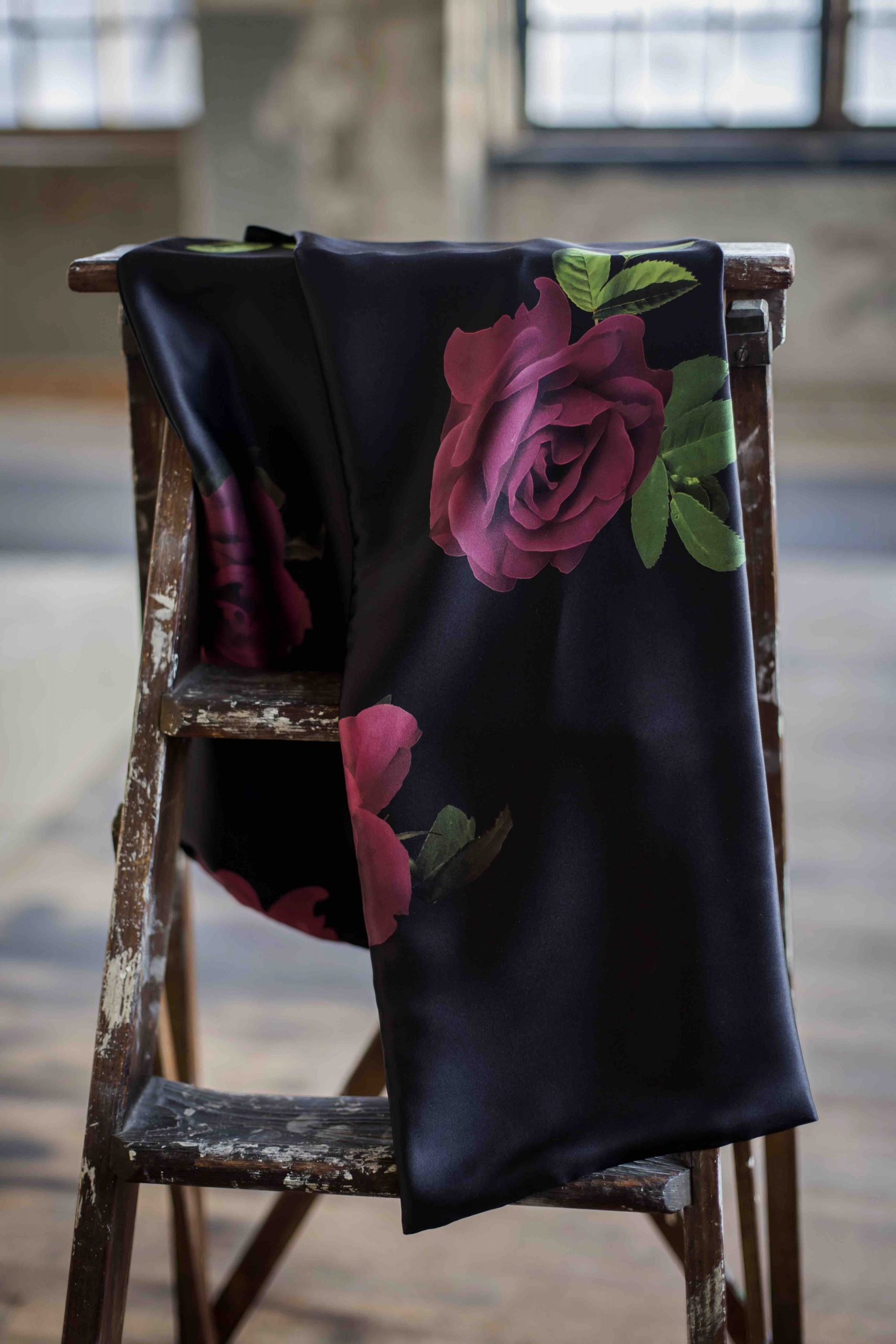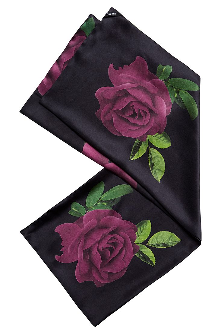 Dubbelsydd sidenscarf i 100% Italiensk siden. Stora vackra vinröda rosor på en svart skimrande botten. Mått 130cm x 23cm. Fin att bara hänga om halsen eller knyta ett varv. Kan med fördel matchas med antingen klänning, kjol eller kappa. Tillverkad på fabrik i Sverige för en hållbar framtid!