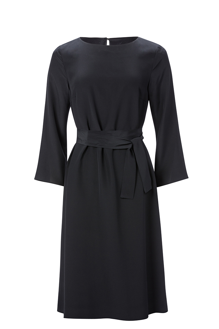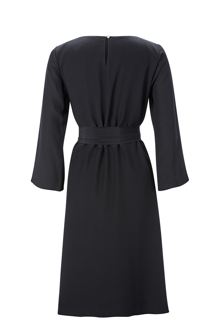 Sofia klänning är gjord i en vacker Italiensk svart sidencrepe. Klänningen är a-linjeformad med ett löst skärp i midjan. En klänning som är användbar vid många tillfällen. Knyt gärna en scarfs i halsen som en tuff detalj. Klänningen är helfodrad och med en trekvart lång ärm. Tillverkad på vår fabrik i Sverige för en hållbar framtid! Titta i vår storleksguide för din rätta storlek.