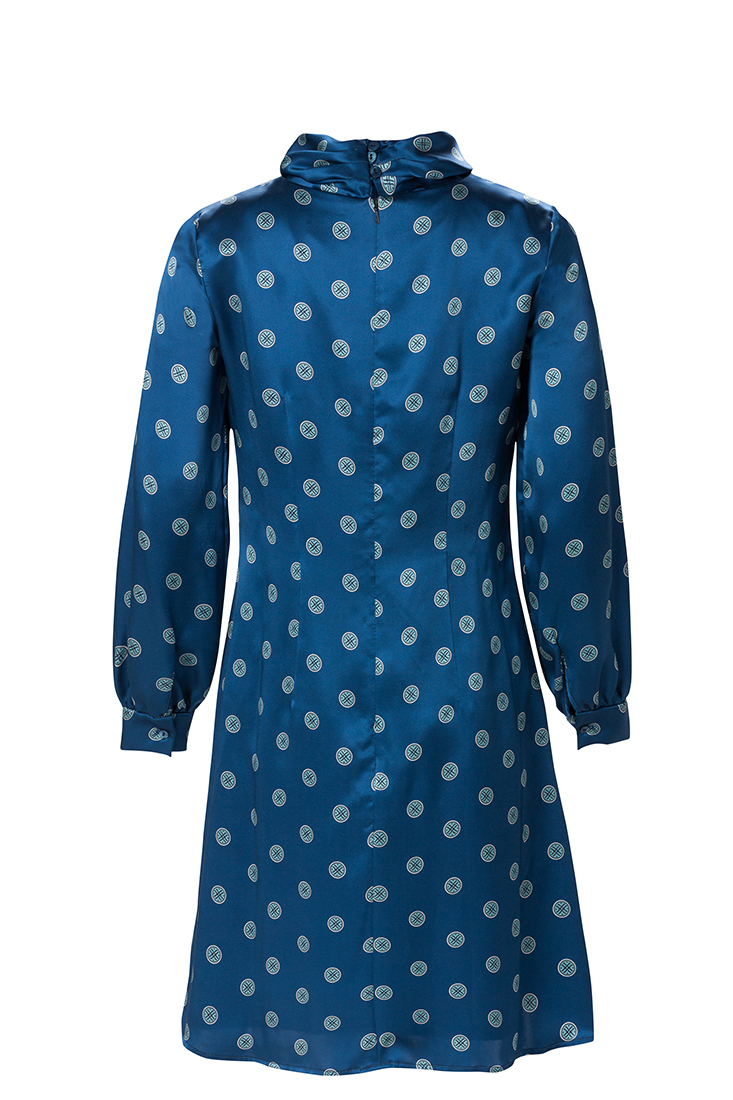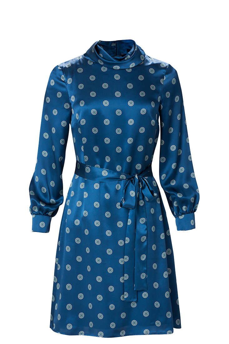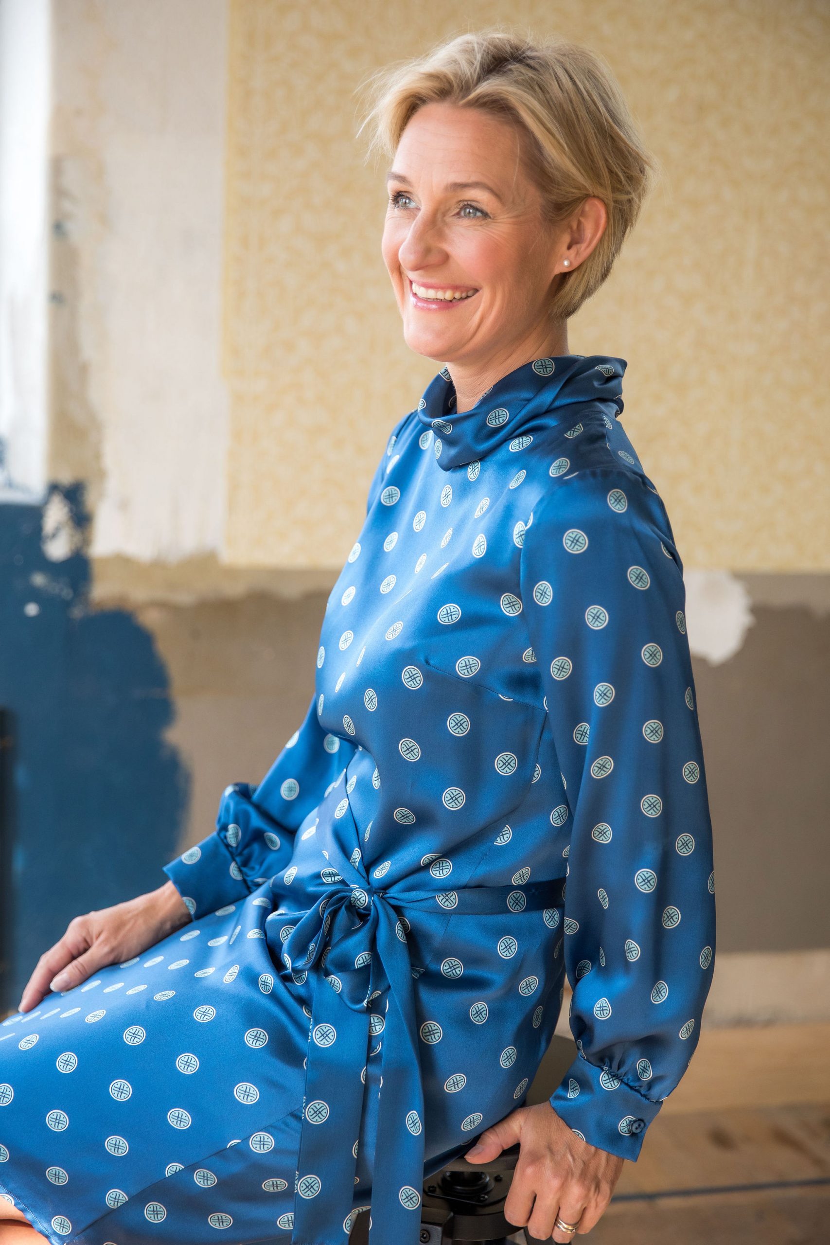 Stella dress has a classical straight cut with a little shape at the waist. Made of Italian silk with a beautifully draped collar and an optional ribbon at the waist, it will be an eye-catcher at the party. Dughult’s own print of small dots on a beautiful cobalt blue bottom. The dress is fully lined with a zipper in the back and buttons at the back of the neck. Made in our factory in Sweden for a sustainable future! Look in our size guide for your right size.