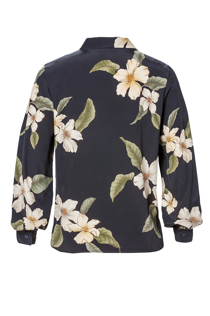 Ida blus är en underbar blus tillverkad i 100% Italiensk siden tryckt med mörkblå blommor på en guldskimrande botten. Halsen kan knytas till rosett eller hänga löst ner som en enkel scarfs.